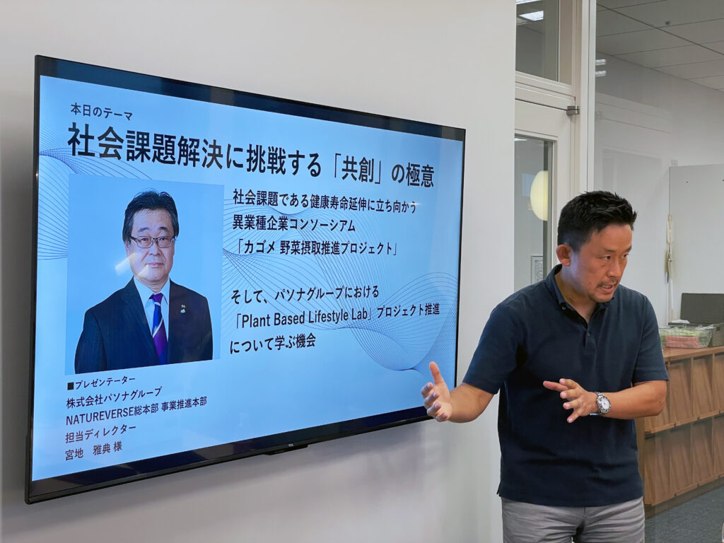 今回プレゼンテーターを務めたのは株式会社パソナグループのNATUREVERSE総本部事業推進本部担当ディレクター・宮地雅典氏。前職である株式会社カゴメで立ち上げ、同氏の退職後も発展し続けている「野菜摂取推進プロジェクト」、現職での「Plant Based Lifestyle Lab」と、これまで企業間の垣根を超えたプロジェクトで社会課題の解決に挑んできた宮地氏。今回の勉強会では、その経験をもとに『社会課題解決に挑戦する「共創」の極意』というテーマで議論が行われました。