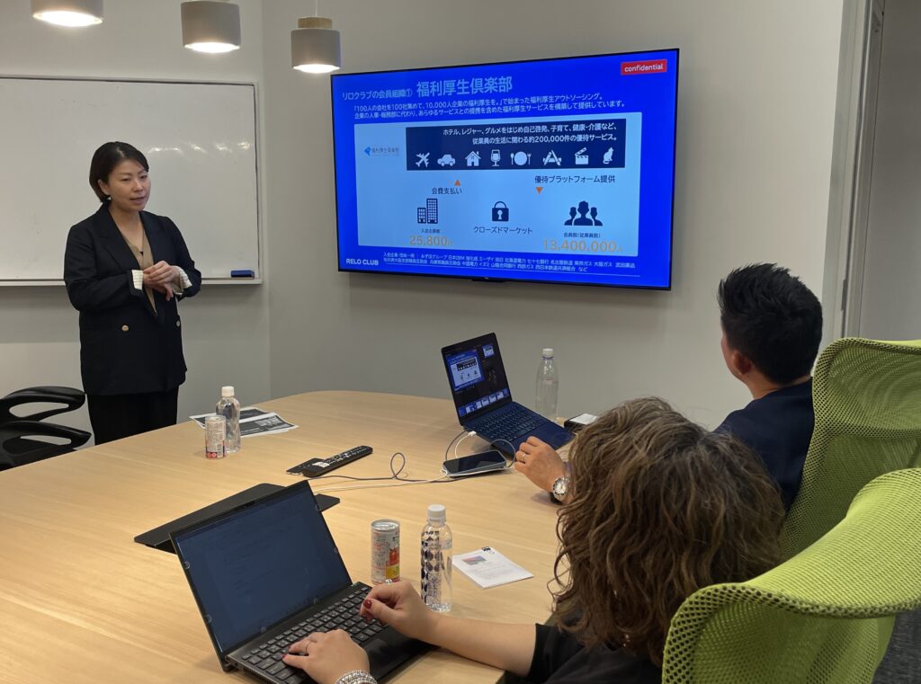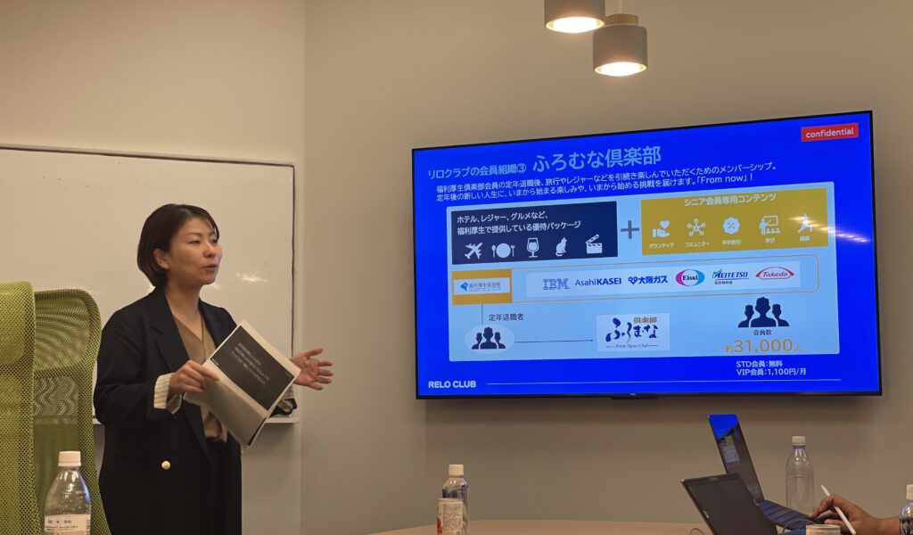 プレゼンテーションでは、株式会社リロクラブの成り立ちや運営している会員組織について総覧した後、シニア世代向けの「ふろむな倶楽部」について詳しい説明へ。「ふろむな倶楽部」在職中にリロクラブの福利厚生サービスを利用していた方が定年退職後も優待などの一部を受けられます。泉山氏から旅行や趣味から学習、ボランティアまで実際に提供しているサービスの一例が示されると、参加者からは驚きの声が上がりました。