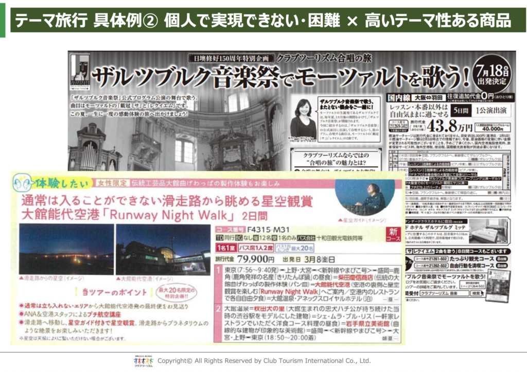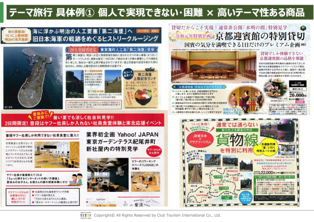 その中で同社が注力しているのが、「個人では実現しにくく、かつテーマ性が深い」テーマ旅行です。歴史・寺社・建築・花・鉄道・写真など、多彩なテーマのもと、専門家やナビゲーターとともに旅を楽しむ企画が展開されており、趣味や関心を深く掘り下げることで、単なる観光にとどまらない旅の価値を生み出している点が印象的でした。
